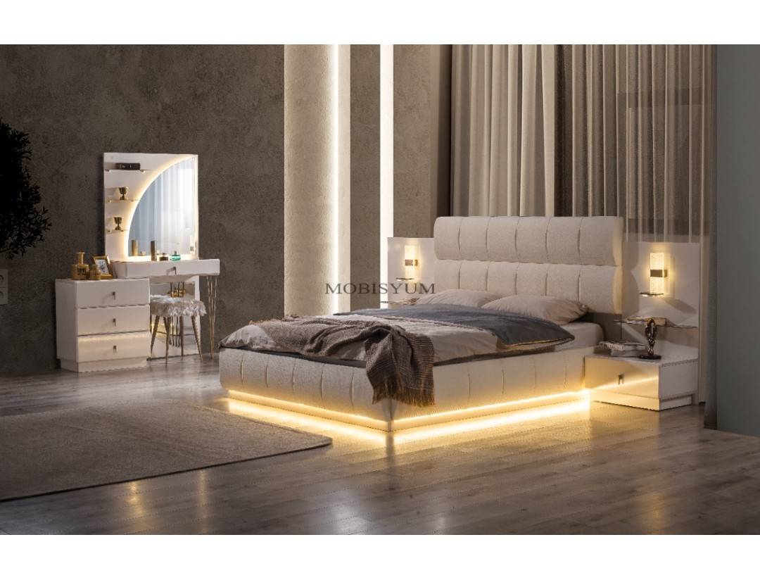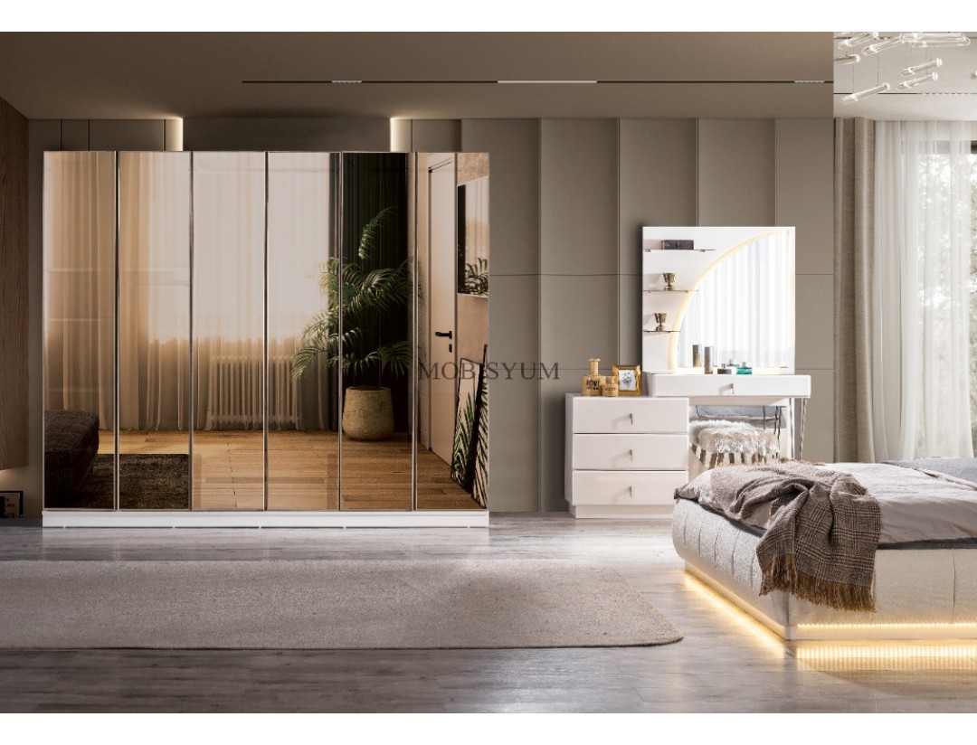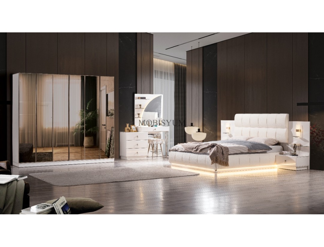 TAKIM İÇERİĞİ | Bir gardırop, bir şifonyer, bir karyola başlık kendinden baza ve iki komodin den oluşmaktadır |